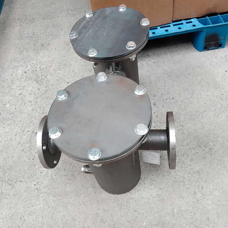 籃式過濾器主要由接管、筒體、濾籃、法蘭、法蘭蓋及緊固件等組成。當流體進入有一定規格的濾網的濾桶后,其雜質被阻擋,而清潔的濾液則由過濾器出口排出,當需要清洗時,只要將可拆卸的濾桶取出,處理后重新裝入即可,因此,使用維護極為方便。籃式過濾器具有結構簡潔,阻力小,排污方便等特點。適用介質可為水、油、氣。一般通水網為18~30目,通氣網為40~100目,通油網為100~480目,可按用戶要求制作濾網,介質溫度:≤200℃。